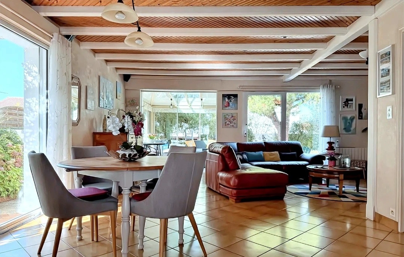 L'intérieur vous séduira par sa grande pièce de vie traversante de 72 m2, incluant une véranda chauffée, ouverte sur une cuisine fonctionnelle.